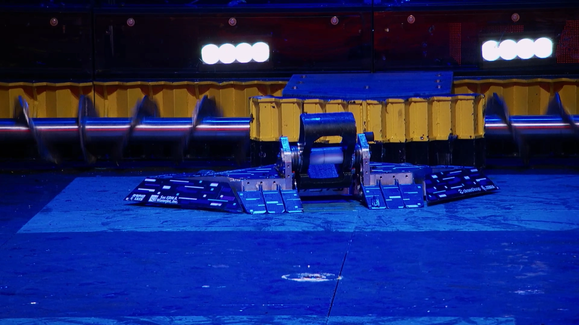 RIPperoni got its disk up to speed while Glitch strafed around the BattleBox, appearing to show improved mobility from the regular season as its newly-fitted eggbeater was also spinning. The pair almost met weapon-to-weapon, but this only resulted in a glancing shot which harmed neither team. RIPperoni continued to circle Glitch before riding up the wide left flank of Kyle Miller's machine.