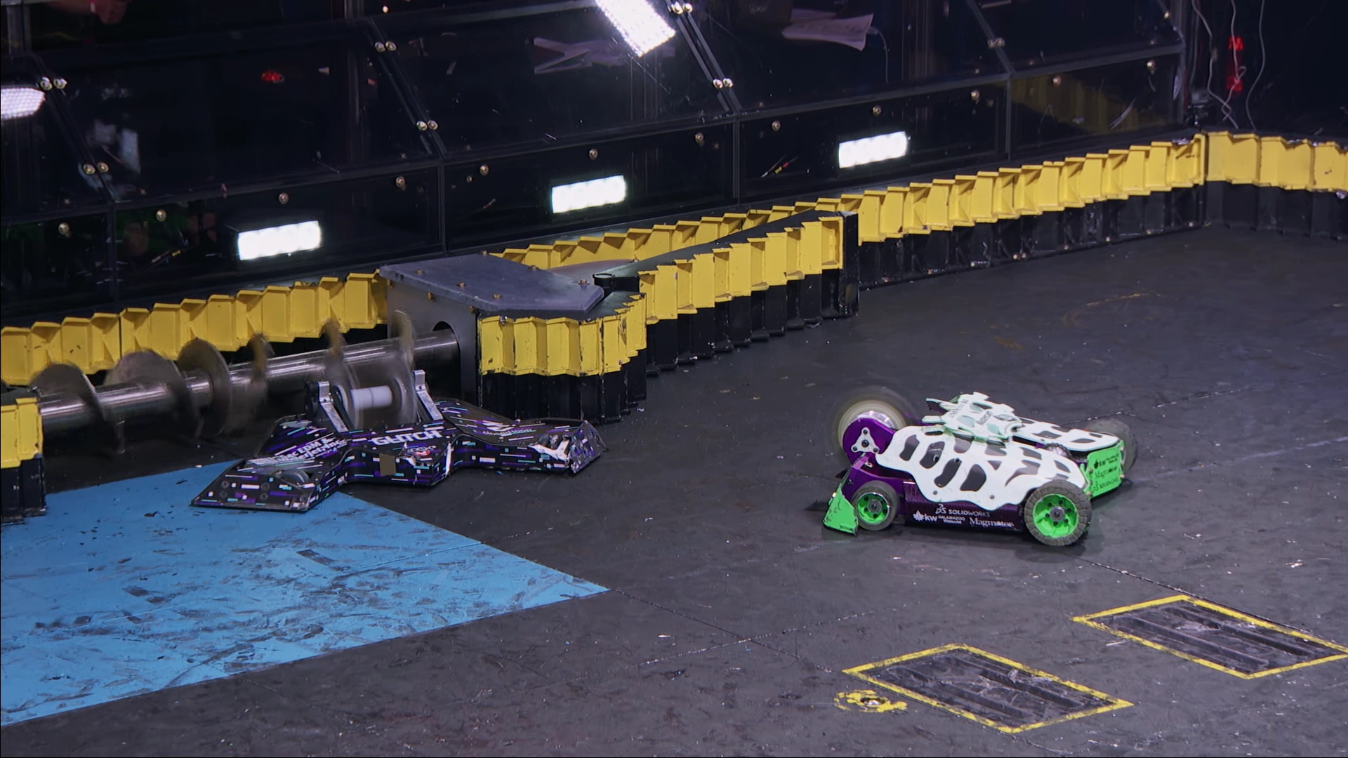 Hydra attempted to right itself but landed on its lid, leaving it vulnerable to Glitch's follow-up, which ripped the tip off of Hydra's flipper and sent it spiralling into the corner. Glitch drifted in pursuit, striking its foe once again as it landed upside down. The Team Whyachi bot landed upright again, but its gearbox had locked up and a speed controller had blown, which when coupled with the neutered flipper it made it difficult for Hydra to engage. The two bots nudged together several times, with Glitch's forks unable to get under Hydra's front and Hydra unable to bring its weapon into use. The two struggled awkwardly to do anything to each other, with Glitch nearly driving itself into the screws, before it landed one more hit that sent the flipper bot spinning towards the wall.