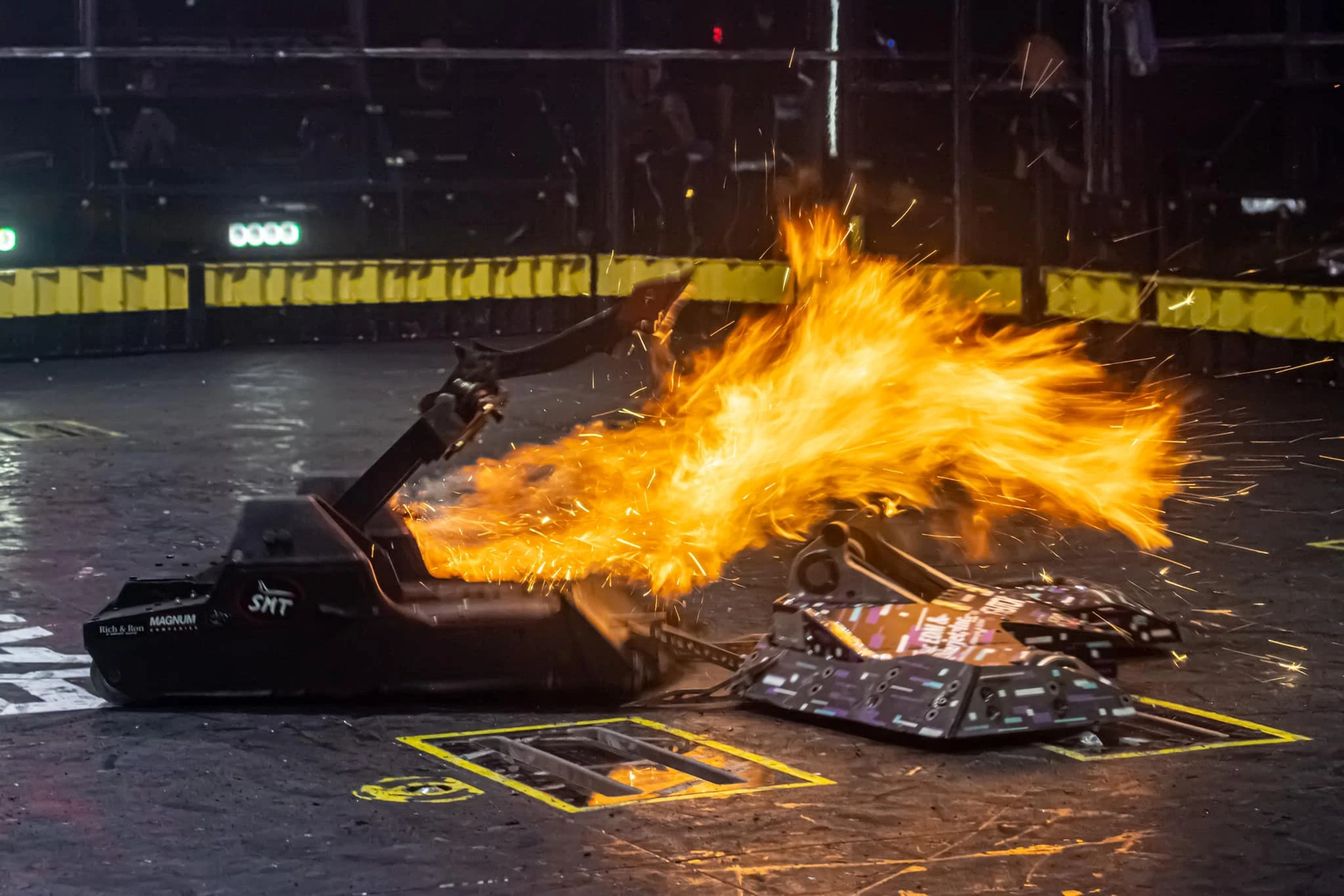 Nevertheless, neither bot had incapacitated the other yet. But with Glitch now backing into the near right corner, Lock-Jaw charged at them from the front yet again. This warped Lock-Jaw's frame and caused a fire somewhere towards the weapon system, but Glitch was launched a few feet in the air and it landed upside down.