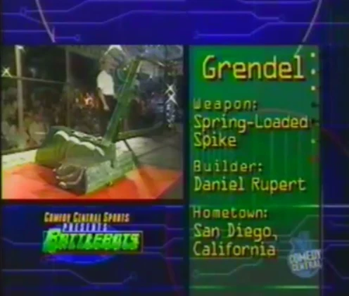 It was a large robot even for its weight class, armed with a large spring-loaded spiked hammer and painted to resemble a dragon. It was built by Daniel Rupert and his high school class. It was a revised version of his previous heavyweight, Malicious Mischief. Grendel performed decently, reaching the quarter-finals in its first and only season. After Season 1.0, Grendel was turned into Revision Z.
