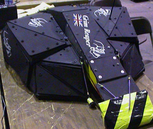 It was a two-wheel drive, octagonally-shaped robot armed with a rear-hinged flipping arm powered by a pneumatic ram. The primary weapon was capable of flipping 220lb opponents and lifting up to 550lbs. Grim Reaper lost its only battle after its aerial was chopped off by Agitator.