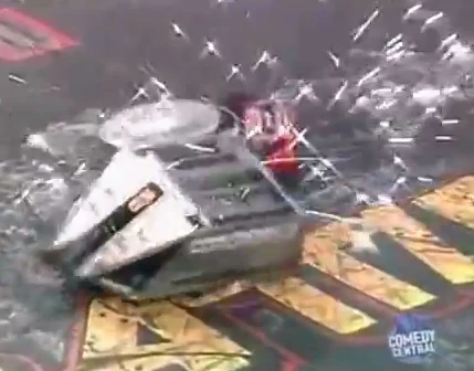 HexaDecimator vs. Aces and Eights Aces and Eights pushes HexaDecimator onto the Killsaws. |