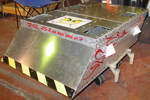 JC Slammer was a heavyweight robot that competed at Season 5.0 of Comedy Central BattleBots. It was a silver parallelogram-shaped robot with no active weaponry, powered by 2 golf cart motors resulting in a top speed of 25 mph. It won one battle in its only season before being eliminated.