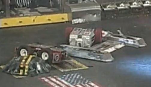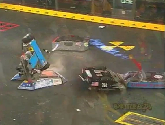 2925 Jack Rabbit vs. Huggy Bear 2925 Jack Rabbit gets pushed onto the killsaws by Huggy Bear. 2925 Jack Rabbit gets caught on the killsaws. In the beginning of the match, Huggy Bear clamped 2925 Jack Rabbit multiple times and dragged it onto the killsaws. 2925 Jack Rabbit managed to escape and the killsaws missed 2925 Jack Rabbit's chain by a 1/16th of an inch. 2925 Jack Rabbit then gets itself caught on the killsaws, which produced a shower of sparks. 2925 Jack Rabbit did some damage to Huggy Bear, with one hit ripping off one of its cover plates. The time ran out and Huggy Bear won the fight on a 29-16 judges' decision. This meant that 2925 Jack Rabbit was eliminated from the tournament. |