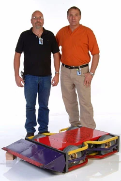 Janus vs. American Justice Janus' first ever opponent in the final preliminary round was against American Justice. Janus easily got its wedge-lifter under American Justice and pushed it into a wall. American Justice looked to have control problems and it kept wanting to go back and forth and wasn't turning very well. Janus continued to push it around, but kept lifting itself up in trying to lift American Justice. That made it hard for it to push American Justice around. It didn't really hurt Janus though as American Justice's maneuverability was just too awful. It never once lined up a hit on Janus. American Justice kept being wedged, lifted, and slowly pushed around the BattleBox before the time ran out. Janus won on a 35-10 judges' decision and advanced to the TV rounds, where it faced Ogre. |