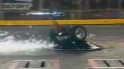 Low Blow vs. Toe-Crusher Toe-Crusher gets caught on top of Low Blow's saw blade. Both robots get hit by the pulverizer. |