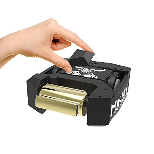 Based on the Team RioBotz machine's World Championship II appearance, the toy features Minotaur's iconic drum spinner. The toy needs to be constructed and includes instructions in the box. It features 16 parts in total, which either clip or press together. These can come off during play to represent damage, and a "kill switch" is hidden behind a removable panel at the back of the toy. When hit, this not only stops the robot from being able to move, but also causes its top panels to fly off and a red light signals that Minotaur has been immobilized. Minotaur is powered via remote control using the four buttons on the front for driving and steering, and two buttons on the top to power its drum spinner. The primary weapon is capable of spinning in both directions and can rotate fast enough to force pieces of other toys in the line to come off.