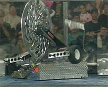 Now in the quarter-finals, Nightmare took on BioHazard. The match began, and Nightmare's weapon spun up, heading towards the center to meet BioHazard. BioHazard attempted to get around the side of Nightmare, but Nightmare moved into it, catching his side panel with the spinning disk and Titanium sparks flew as the hinge was torn up. BioHazard tried again to lift Nightmare's left wheel in the air, but the gyroscopic forces of Nightmare's disk at full speed caused it to lift almost straight up in the air instead of tipping. Nightmare backed off BioHazard and moved into position again. BioHazard attempted to move around Nightmare again, but this time, the teeth of Nightmare's spinning disk gashed deeply into BioHazard's side skirt and BioHazard got sent flying. Pieces of titanium rained down on the BattleBox floor for several seconds. The titanium skirt on BioHazard had been nearly completely cut in half. Nightmare was then blindsided by BioHazard, who pushed Nightmare over the killsaws then under the pulverizer, using its lifting arm to suspend Nightmare right underneath the pounding hammer. The top armor on Nightmare was very tough, but Nightmare did not move again. The problem was that the armor that Jim had installed above Nightmare's speed controller had been hit hard enough to break the welds, causing the armor assembly to crash down on the Vantec, disabling the drive system. BioHazard won by knockout and Nightmare was eliminated from the tournament.
