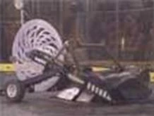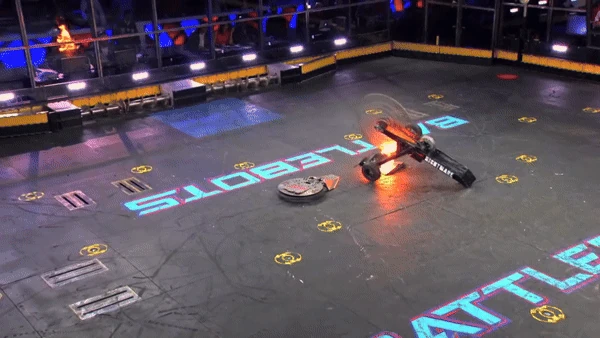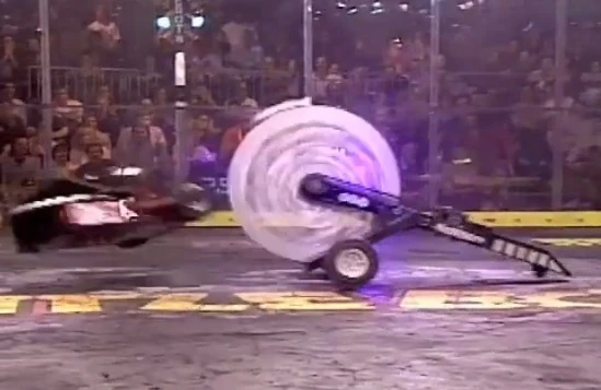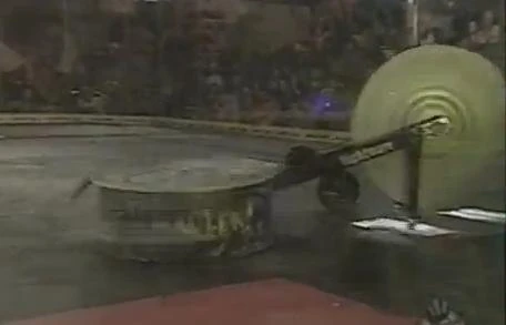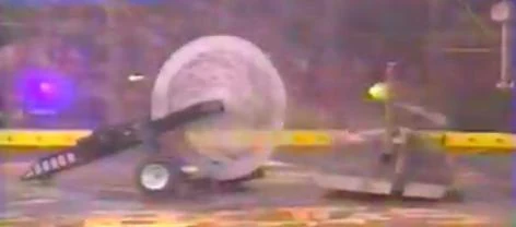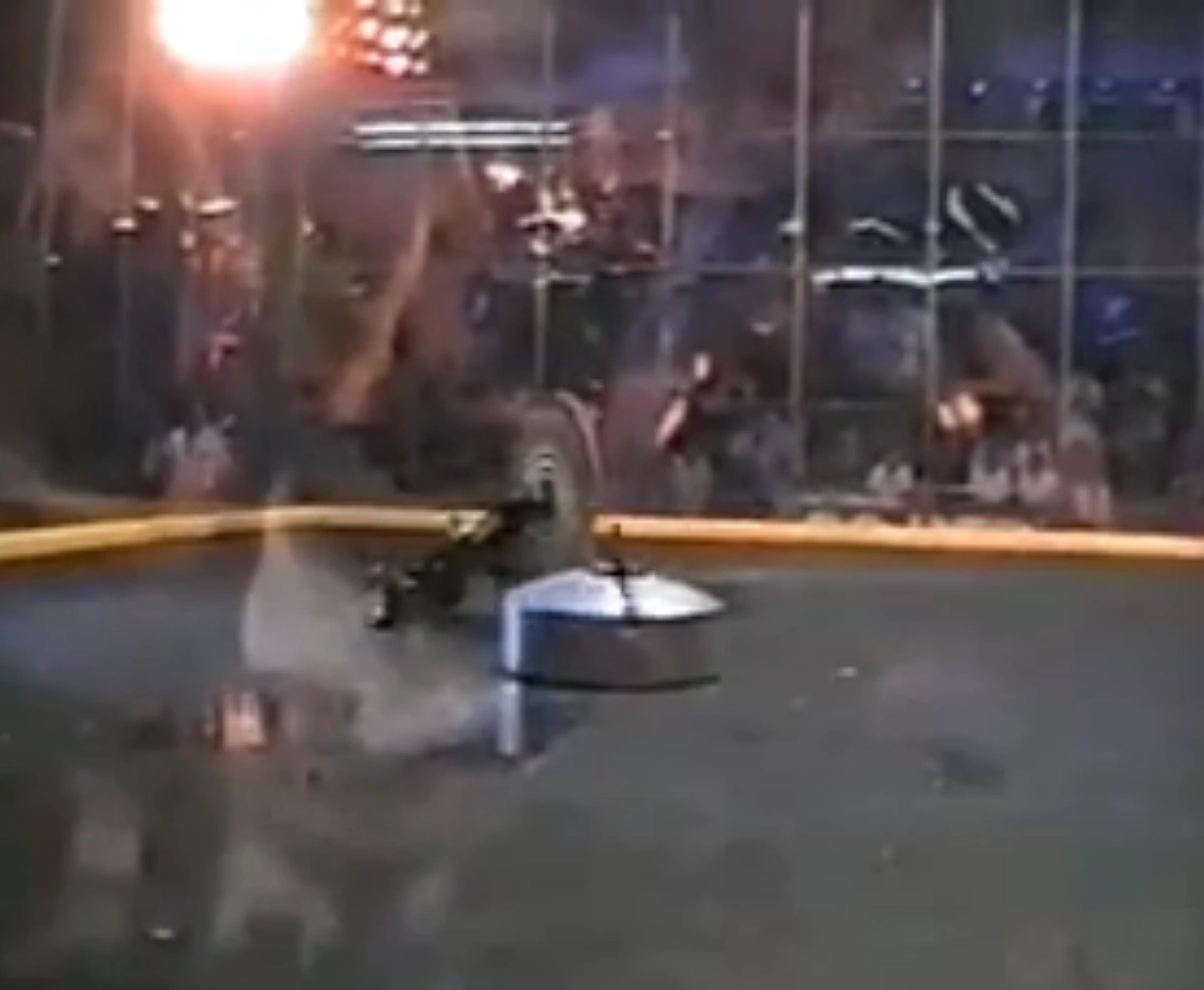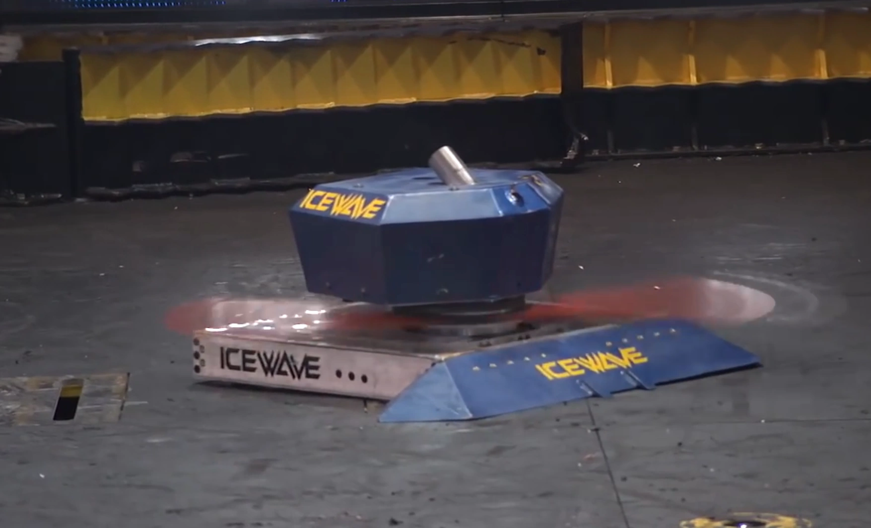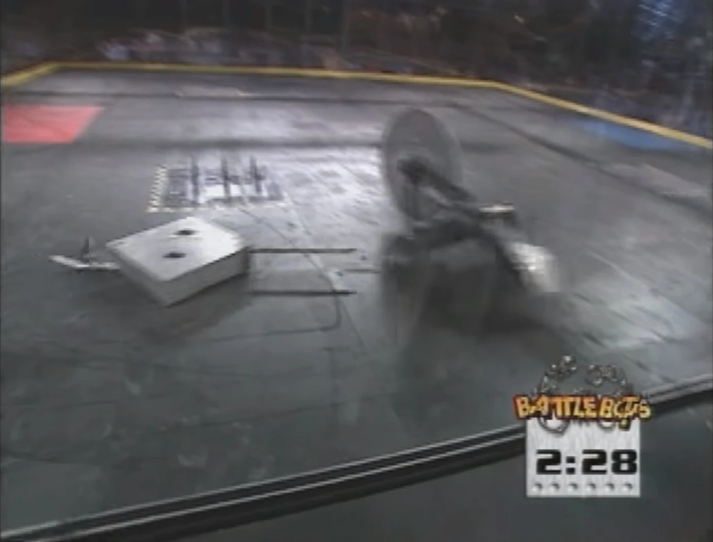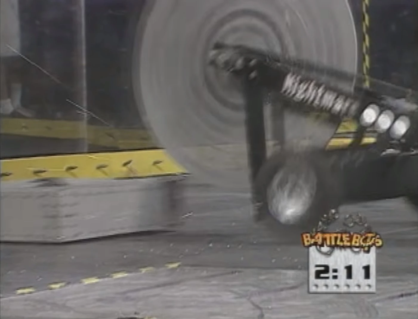 Nightmare was fastest to get its blade up to speed as both robots met in the middle of the arena. Jim Smentowski's robot struck the side of Icewave, but the gas-powered spinner managed to bend Nightmare's weapon shaft, causing its disk to bounce against the steel floor as a belt was also torn away from the vertical spinner.