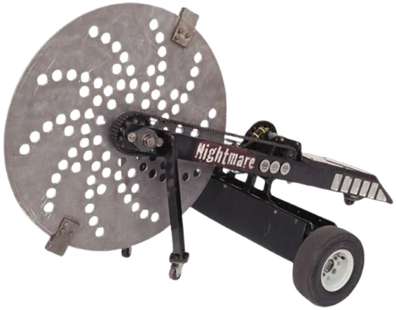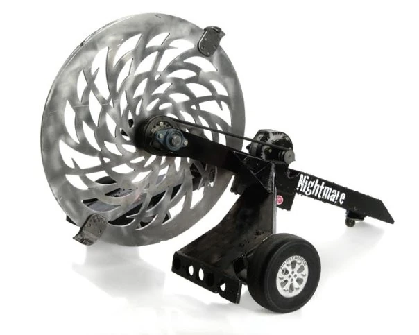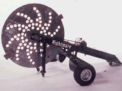 The robot's primary weapon was a 4ft diameter, ⅜" thick vertical spinner made from T-6061 aluminum with teeth on either side of the disk.[1] It debuted in 1999, becoming an instant fan favorite due to its huge vertical spinning weapon in relation to the rest of its chassis. Returning in 2015, an upgraded version of Nightmare competed in the 2015 and 2016 seasons before Jim Smentowski entered Breaker Box in its place. It returned for a one-off exhibition match having been a static display in the past, but has not competed since.