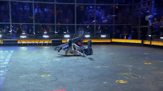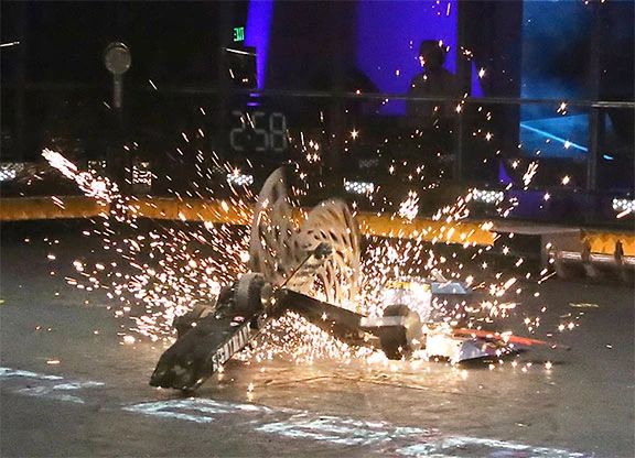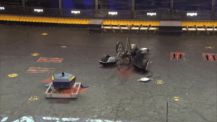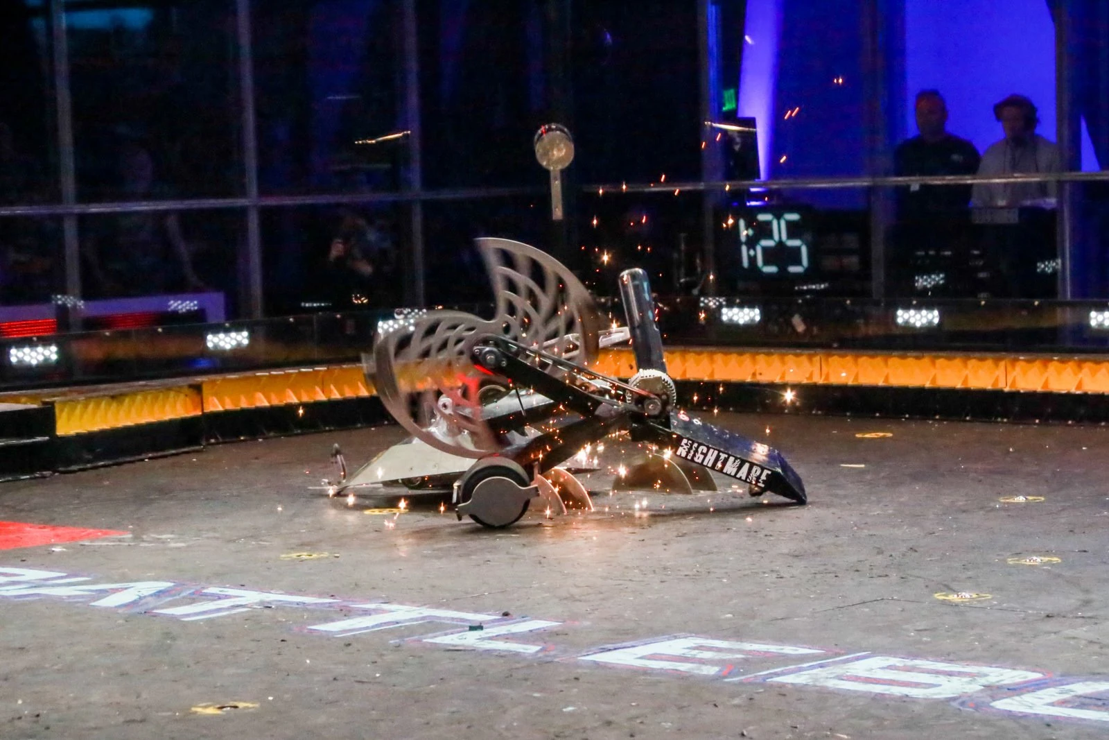 In doing so, Nightmare clambered over its opponent, eventually ending up underneath the pulverizer, where the Ewert family pinned it in place. Nightmare escaped, but as the fight ticked past the halfway point, drove itself on top of the screws, beaching itself atop the hazard with none of its drive wheels touching the floor. Nightmare desperately spun its blade, but was stuck as Team Whyachi began to celebrate.