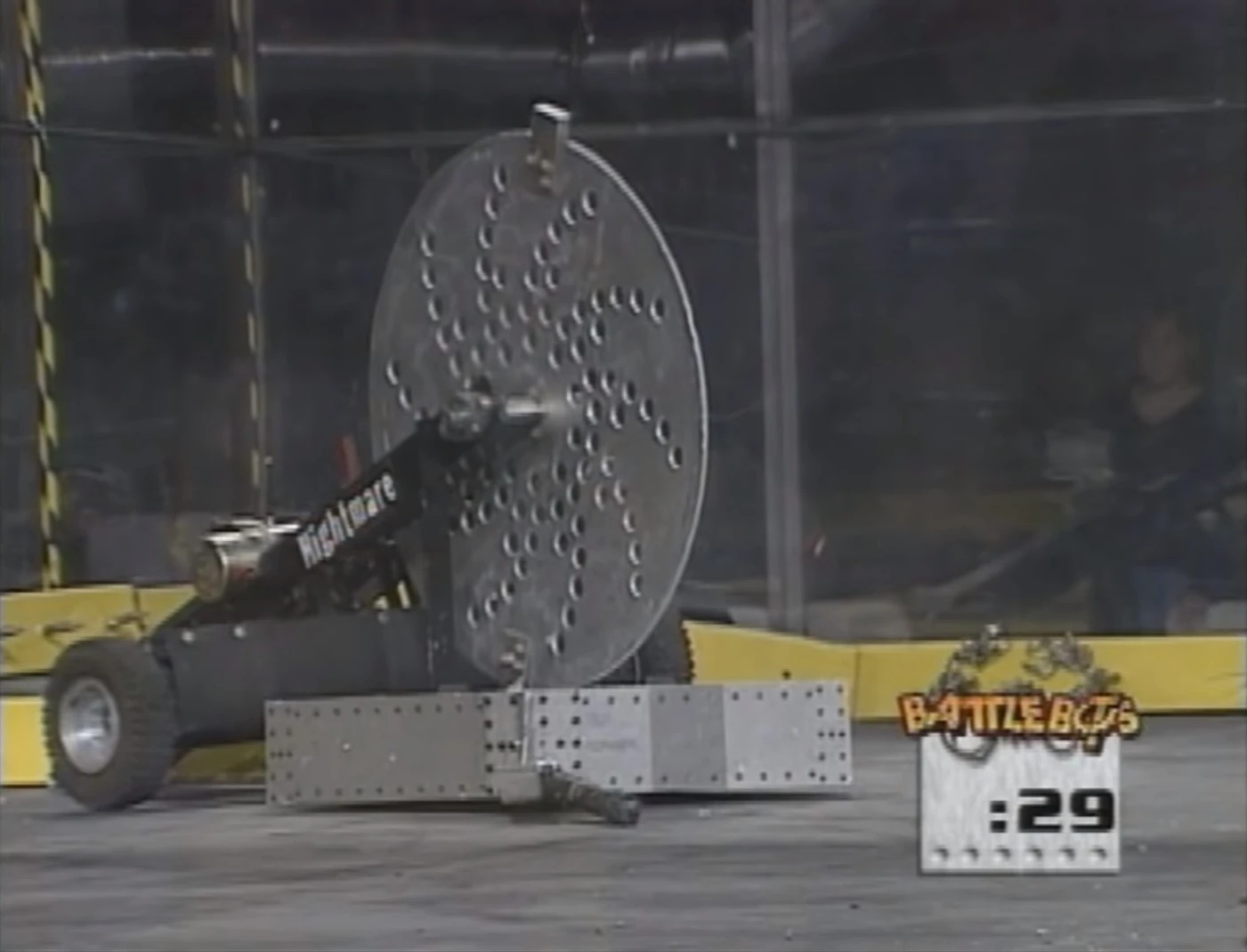 Despite not competing in the main tournament, Nightmare participated in an exhibition match against Mammoth alongside Breaker Box'sminibot, Hacker. The match started off okay for Nightmare as it got to the side of Mammoth and hit it. But then, Mammoth's spinning lifter caught Nightmare's frame close to the disk, causing Nightmare to lift up a bit, then hit the floor with its disk and end up onto the screws. Nightmare was able to escape, but was quickly toppled by Mammoth. Nightmare remained upside down as it was pushed into the corner and counted out, giving Mammoth the win by KO.
