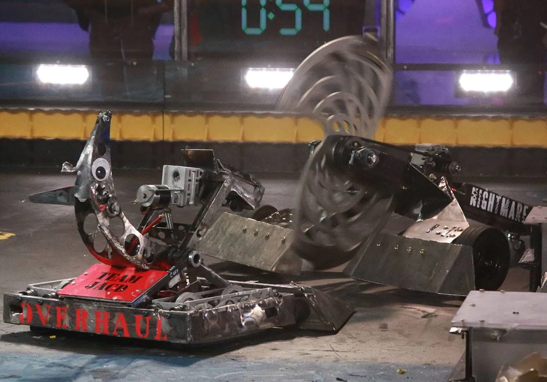 With Witch Doctor incapacitated, Nightmare and Overhaul duelled in the middle of the arena. The blade of Nightmare, which proved a constant threat to Team JACD's robot, made contact with Overhaul's frame several times.