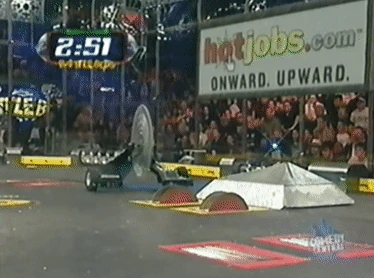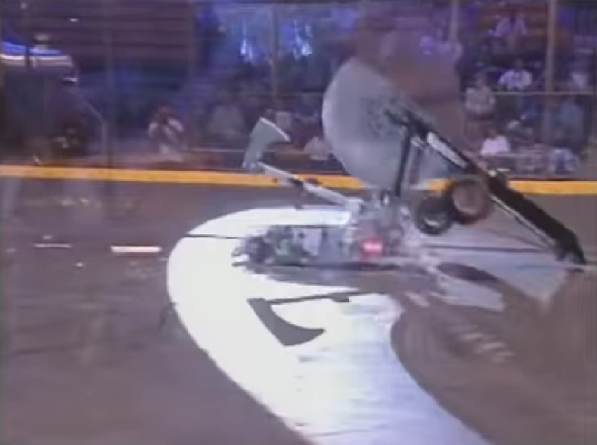 Shortly after, the lone robot Warrior drove to the center of the arena, tanking several glancing shots from Nightmare before using its front wedge to upend Jim Smentowski's machine, much to the excitement of Clint Ewert. Though Nightmare did not have a conventional self-righting mechanism, it attempted to use a combination of one drive wheel and its primary weapon to flip itself back over.