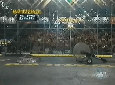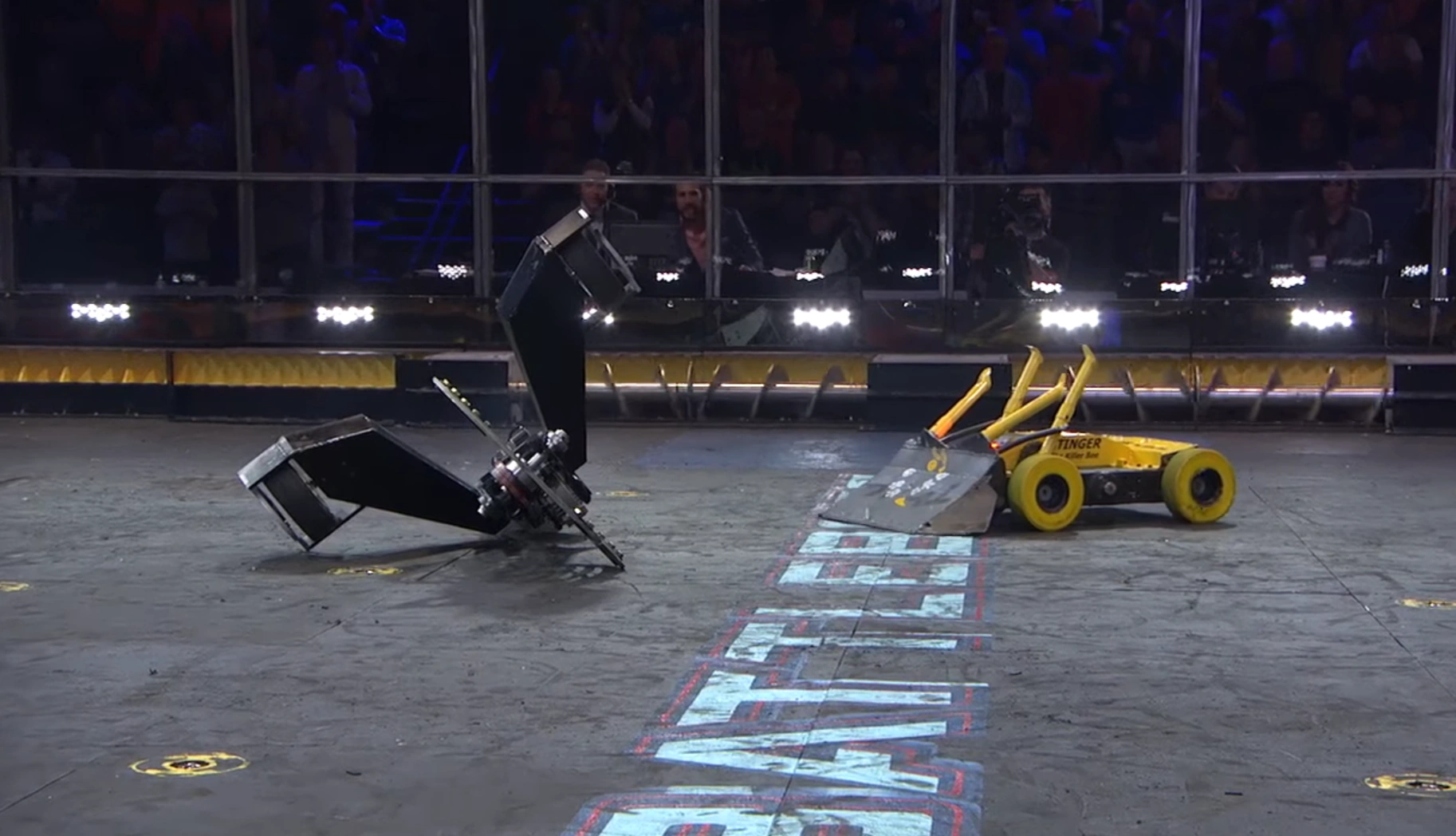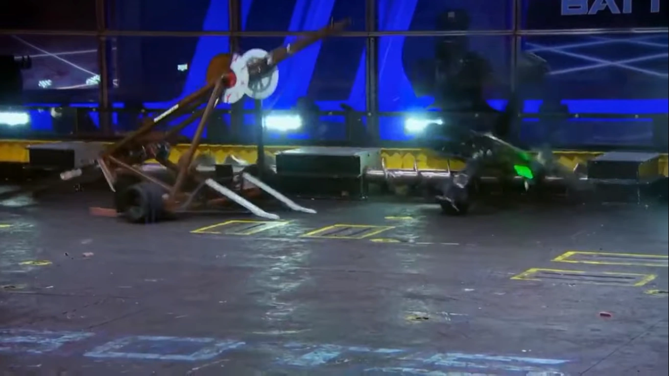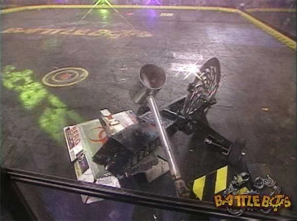 Keen to retaliate, Stinger ignited its flamethrowers and hoisted its opponent, driving it to the middle of the arena and overturning Nightmare. As one of the sensors for the self-righting arms had broken loose, the pin was unable to loosen in order to assist Nightmare in righting itself.