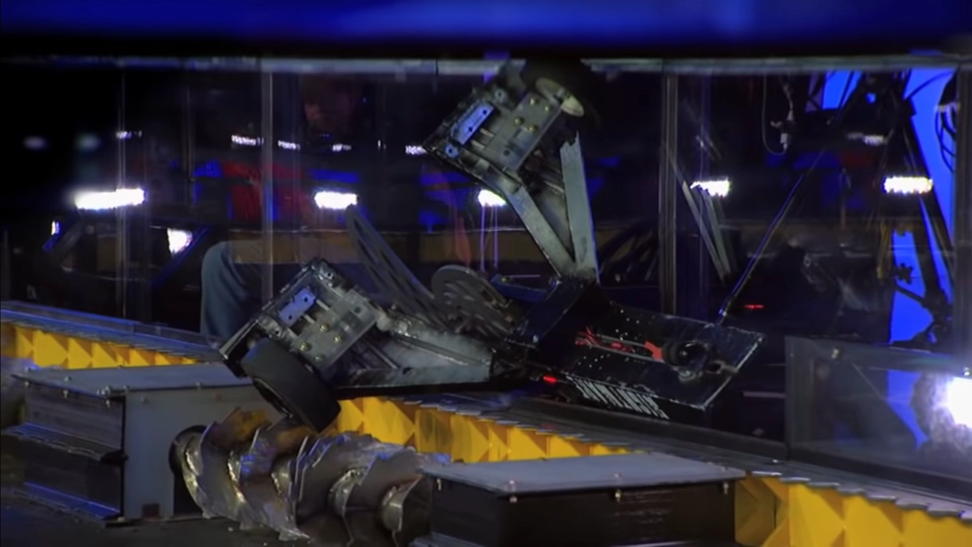 While this was happening, Witch Doctor had been repositioned underneath the pulverizer by Shaman and its team used the hazard in a desperate attempt to flip it over and continue the fight. As per Rumble rules, Witch Doctor was not counted out despite being immobile for over a minute by this point in the fight.