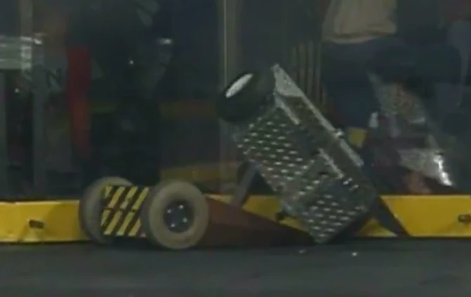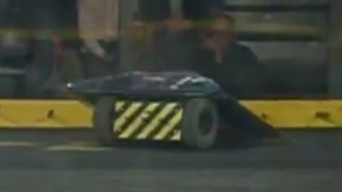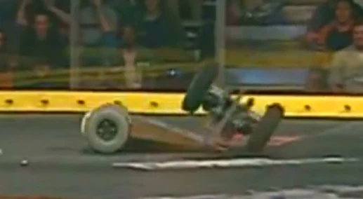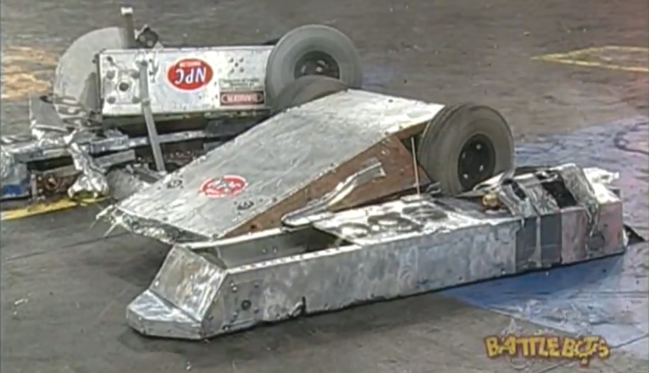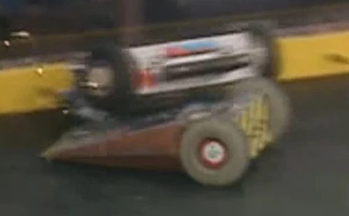 Psychotron vs. THWAK! Psychotron flips THWAK! onto its back. Psychotron first drew the successor to the reigning middleweight champion, THWAK!. For this match, Psychotron's rear spikes were covered by a block of wood to prevent damage from THWAK!'s spinning bar. Psychotron was the aggressor in this fight, chasing THWAK! around the arena and flipping THWAK! onto its back, immobilizing its spinning weapon. It even pinned THWAK! against the arena wall at one point in the match. However, THWAK! was able to cause some damage to Psychotron's wedge and it managed to get underneath the front of Psychotron with its wedge after it was flipped. In the end, the time ran out and THWAK! won the fight on a close controversial 23-22 judges' decision. This meant that Psychotron was eliminated from the tournament. |