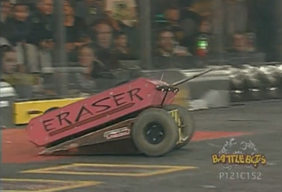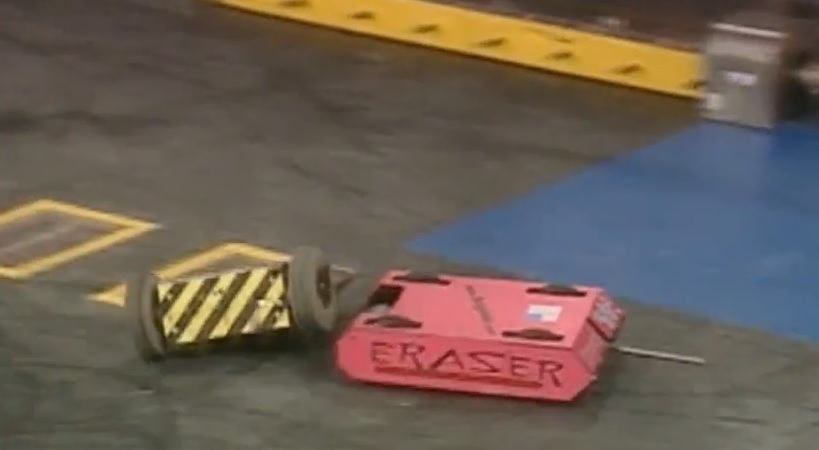 Psychotron vs. Eraser Eraser hits Psychotron with its spinning drum. Psychotron pushes Eraser toward the screws. |
