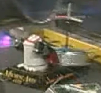 Rambite vs. Sallad This win put Rambite into the next round, where it faced Sallad. Rambite got two attacks in but the second attack bent the outside portion of Rambite's shell. The bend caused the shell to rub on the chassis, which prevented Rambite from spinning. Since most of the teams effort in creating Rambite's weapon, Rambite could not compete with Sallad when it came to pushing. He pushed Rambite around, over saws, and under the hammer. One attempt to ram Rambite caused Sallad to get its arm stuck under the entrance ramp. Sallad's efforts to get free caused its motors to smoke. Sallad was being counted out when the fight ended. Unfortunately for Rambite, there was 3 seconds left on the count so the fight went to a judges' decision which Sallad won 30-15. This meant that Rambite was eliminated from the tournament. |