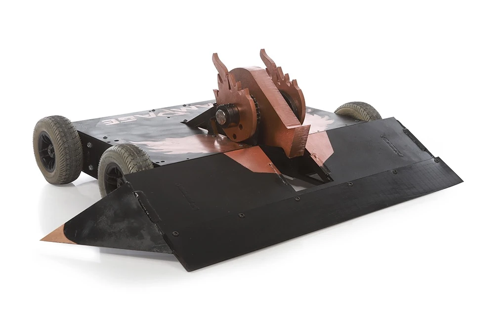 It is a large, box-shaped robot which is black and bronze in appearance, armed with a single-toothed vertical spinner at the front capable of hitting 180mph. In its debut year, Rampage was two-wheel drive and featured 90 degree L-brackets bolted to the front face. Notably, these were fixed in place, so struggled to get underneath opponents and feed them into the disk as intended. According to the CAD submitted to BattleBots ahead of its debut year, Rampage was supposed to be fitted with a front-mounted lifter and sloped wedge as well, though this was scrapped in the build stage "due to time and cost constraints", according to the team.