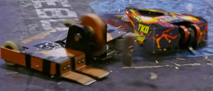 Rampage vs. MadCatter After 1-1 SMEEEEEEEEEEEEE withdrew from the main competition due to damage withstained by previous opponents, Team X were granted their first televised fight in the form of a match against MadCatter following SMEEEEEEEEEEEEE's withdrawal. Rampage is thrown around by MadCatter. In a March 2022 post from the team, they revealed MadCatter's assault on Rampage shattered the magnets within all four drive motors and warped the entire frame.[2] |