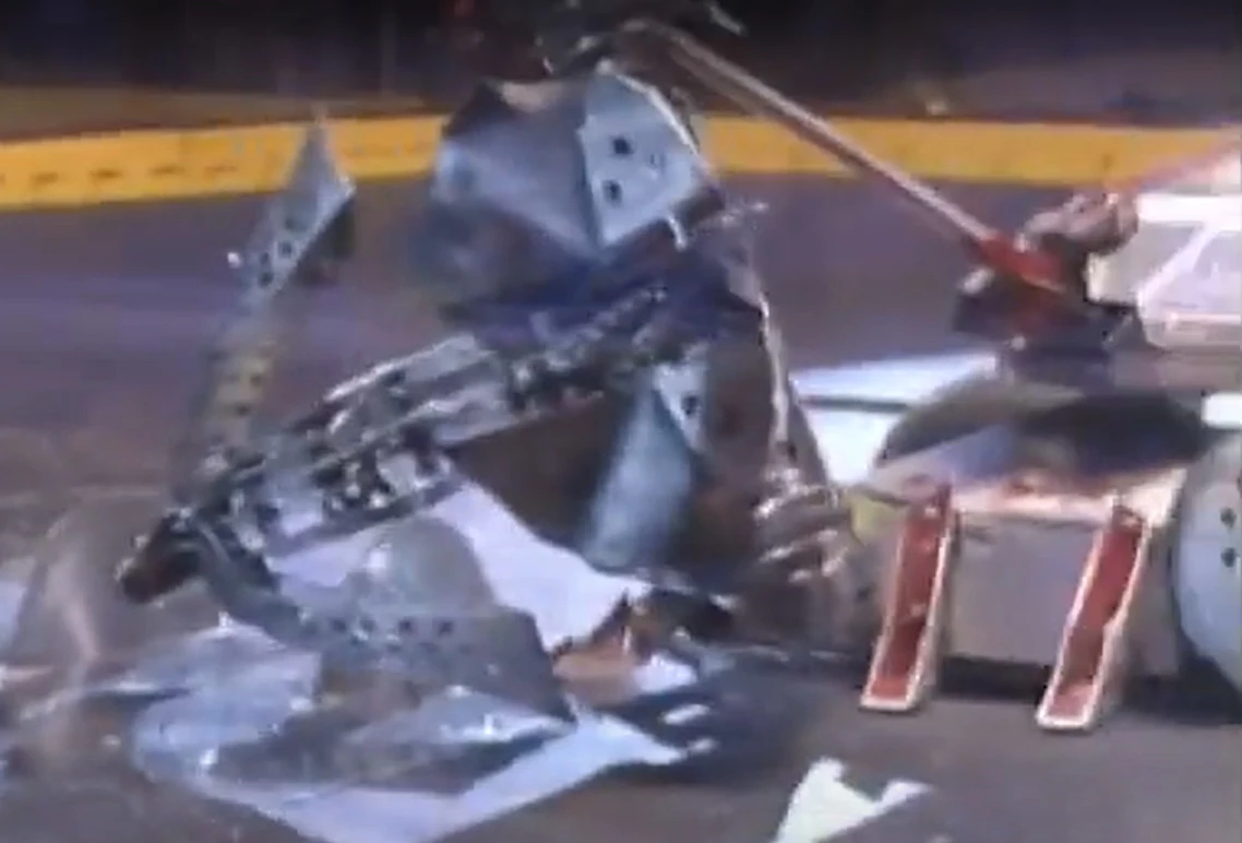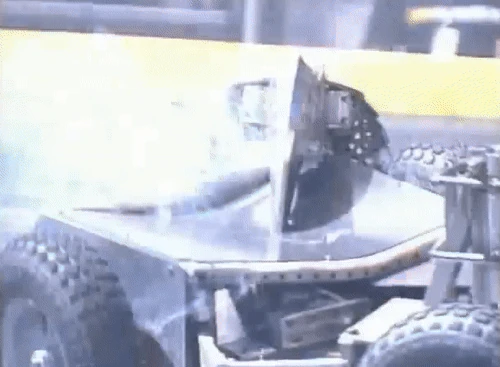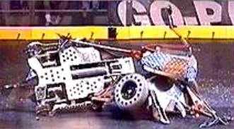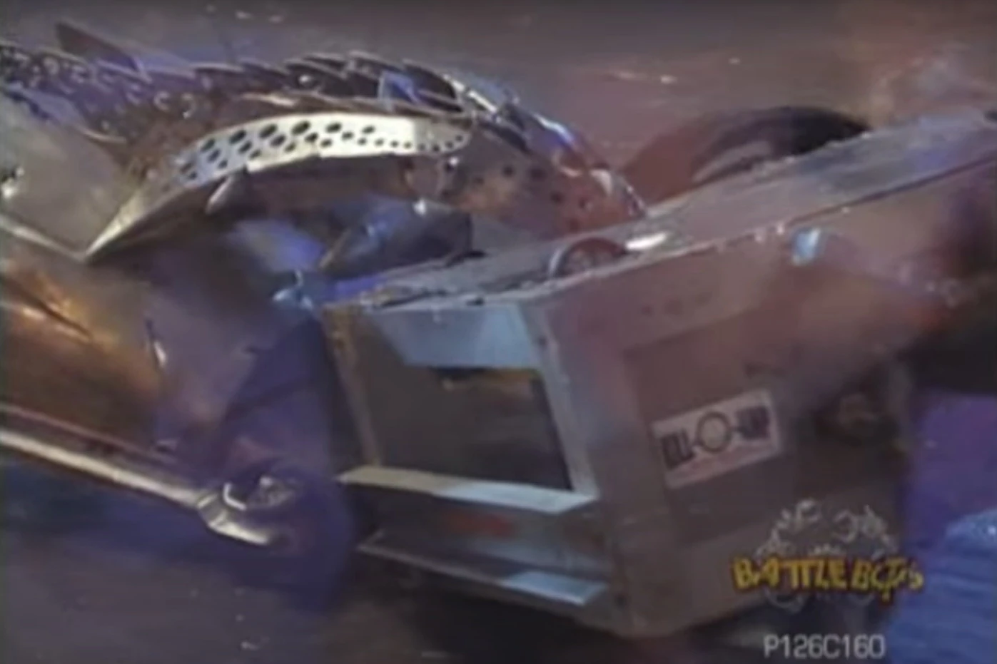 Razer crushes the back of its opponent, Aggrobot, during Series 3 of Robot Wars.