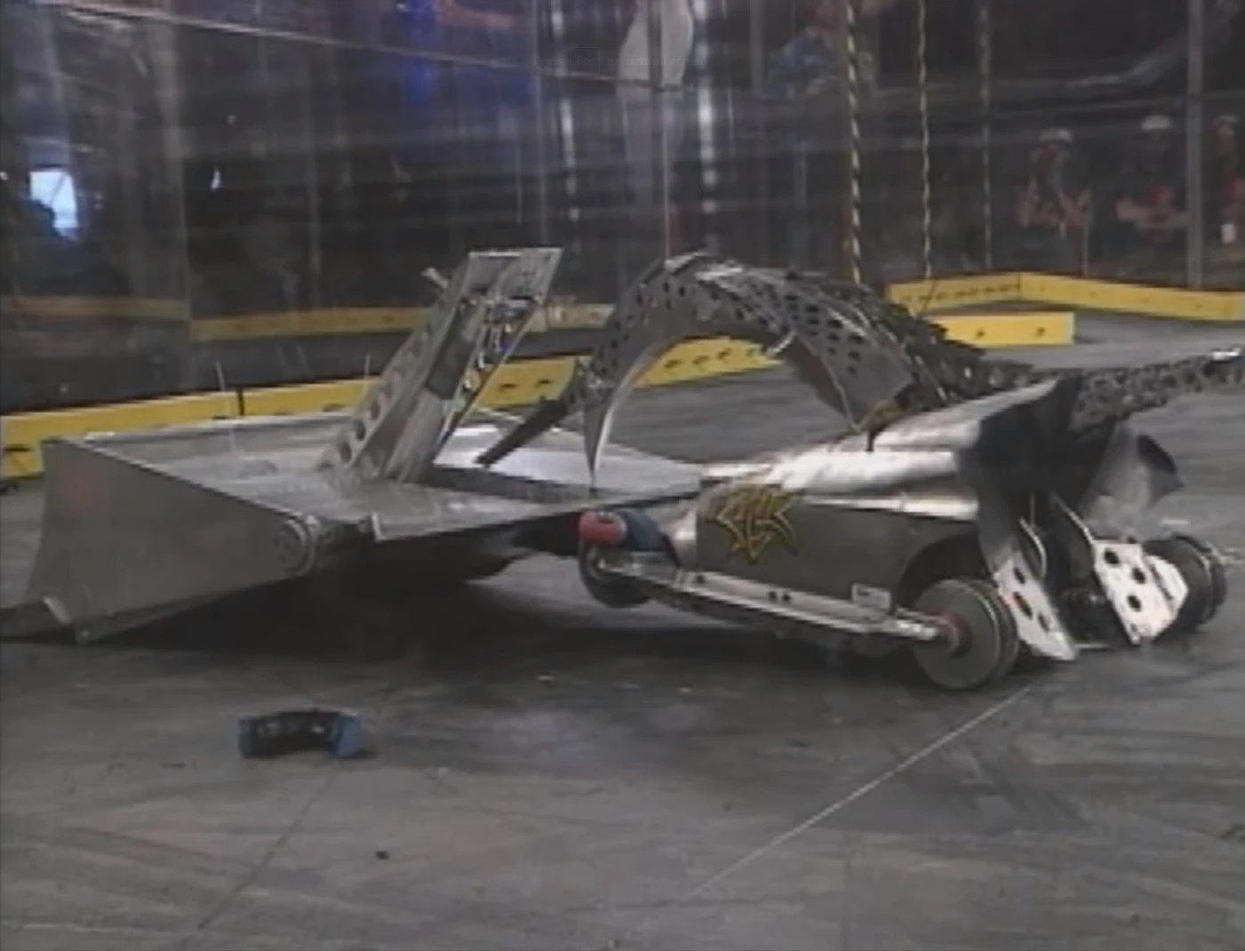 In the third stage of the main bracket Razer faced Tazbot - built by Donald Hutson. The fight started with both machines looking to find an area on their opponents to exploit, but it was Tazbot which managed to prise its way under Razer first. After a lengthy lift from Tazbot, Razer dropped down without any further punishment, before it tried to respond with an attack of its own - though this was halted by the wedges that surrounded Tazbot. Tazbot's next attack managed to tip Razer onto its side, but the British machine kept itself upright by digging its weapon into Tazbot's arm. Tazbot used this purchase to maneuver Razer towards the killsaws, before the front of Tazbot's arm came into contact with another set of killsaws. Tazbot's next attack turned Razer over fully, which allowed it to pin Razer in on the killsaws as the UK machine attempted in vain to bring its self-righting wings into play. After a period, Razer did right itself, but Tazbot quickly followed up by jamming its arm in between the area where Razer's wings were retracting to. Both machines then skittered over the killsaws, and after one more interaction with the arena trap Razer managed to break itself free from Tazbot's grip. Tazbot then carried out a partial lift on Razer before Razer drove Tazbot into the spikestrips. A period of jostling followed, before Tazbot once again lifted Razer over and onto the killsaws before pinning it down from above. Razer attempted to use its self-righting mechanism to get back over but the mechanism had been damaged by one of the spikes on the floor and jammed before failing completely. Tazbot won by knockout which left Razer in the loser's bracket.