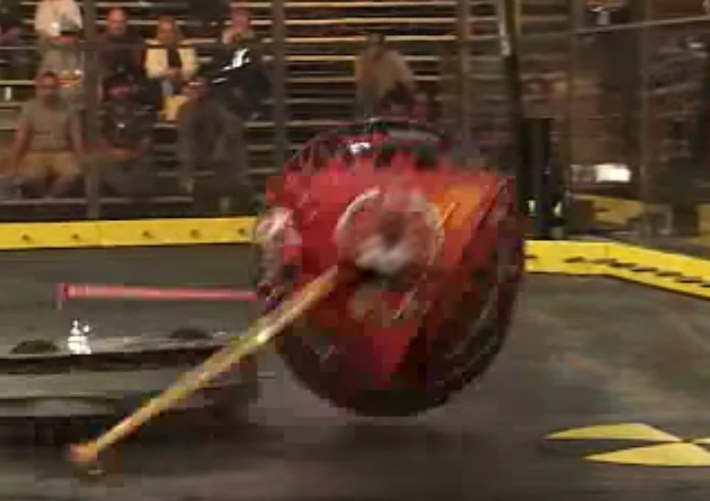 Ripkin vs. Towering Inferno Ripkin strikes Towering Inferno as Towering Inferno drops its hammers on top of Ripkin. Ripkin's first opponent was Towering Inferno. After Ripkin delivered multiple hits to Towering Inferno, the time ran out and Ripkin won on a 27-18 judges' decision. This win put Ripkin to the next preliminary round, where it faced Crash Test Dummy. |