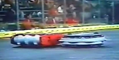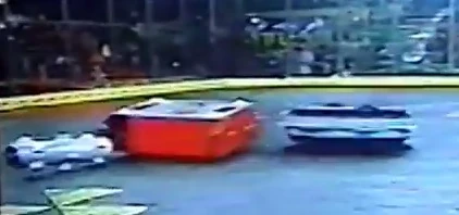 Ripkin vs. Tulsa Hurricane Ripkin and Tulsa Hurricane get stuck together. Ripkin rips off Tulsa Hurricane's spinning drums. In the beginning, Tulsa Hurricane started spinning its drums and went straight at Ripkin, but it started running away and got hit by Ripkin's spinning toothed ring from the side. This impact got Ripkin's spinning toothed ring stuck right into the side of Tulsa Hurricane and both robots were stuck together and had also immobilized Tulsa Hurricane's drums. Both bots were separated after they hit the spike strip and Tulsa Hurricane ran away. Tulsa Hurricane went straight at Ripkin and got hit by the spinning toothed ring again. Tulsa Hurricane got stuck on the entrance ramp and Ripkin hit it off the ramp. After more hits from Ripkin, Tulsa Hurricane's spinning drums were loose and after one more strong hit, both drums came off.Towards the end of the match, Ripkin kept hitting the sides of Tulsa Hurricane and it stopped moving before the time ran out. Ripkin won on a 43-2 judges' decision and advanced to the TV rounds, where it faced Diskontent. |