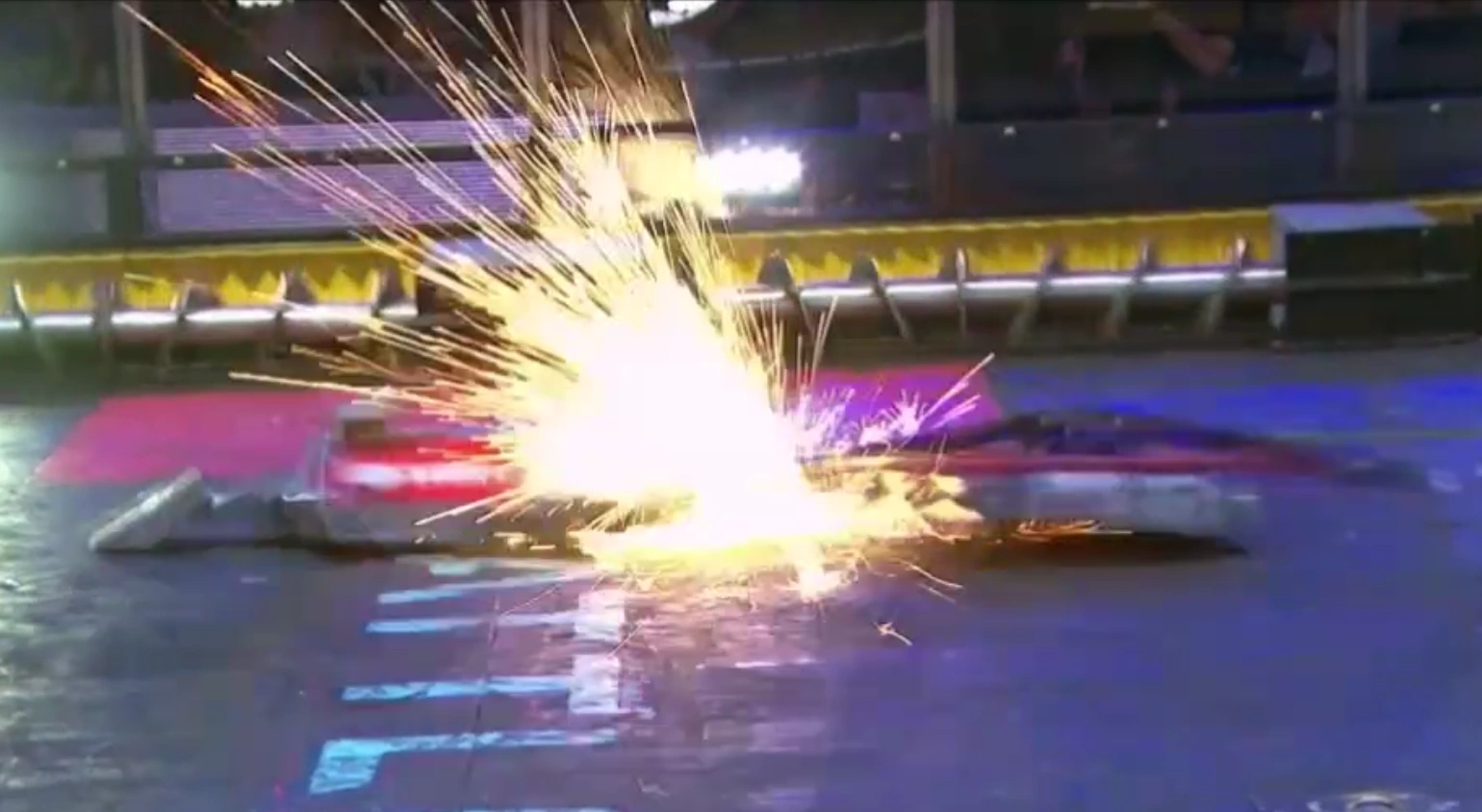 The initial hit between the two finalists, causing a shower of sparks.
