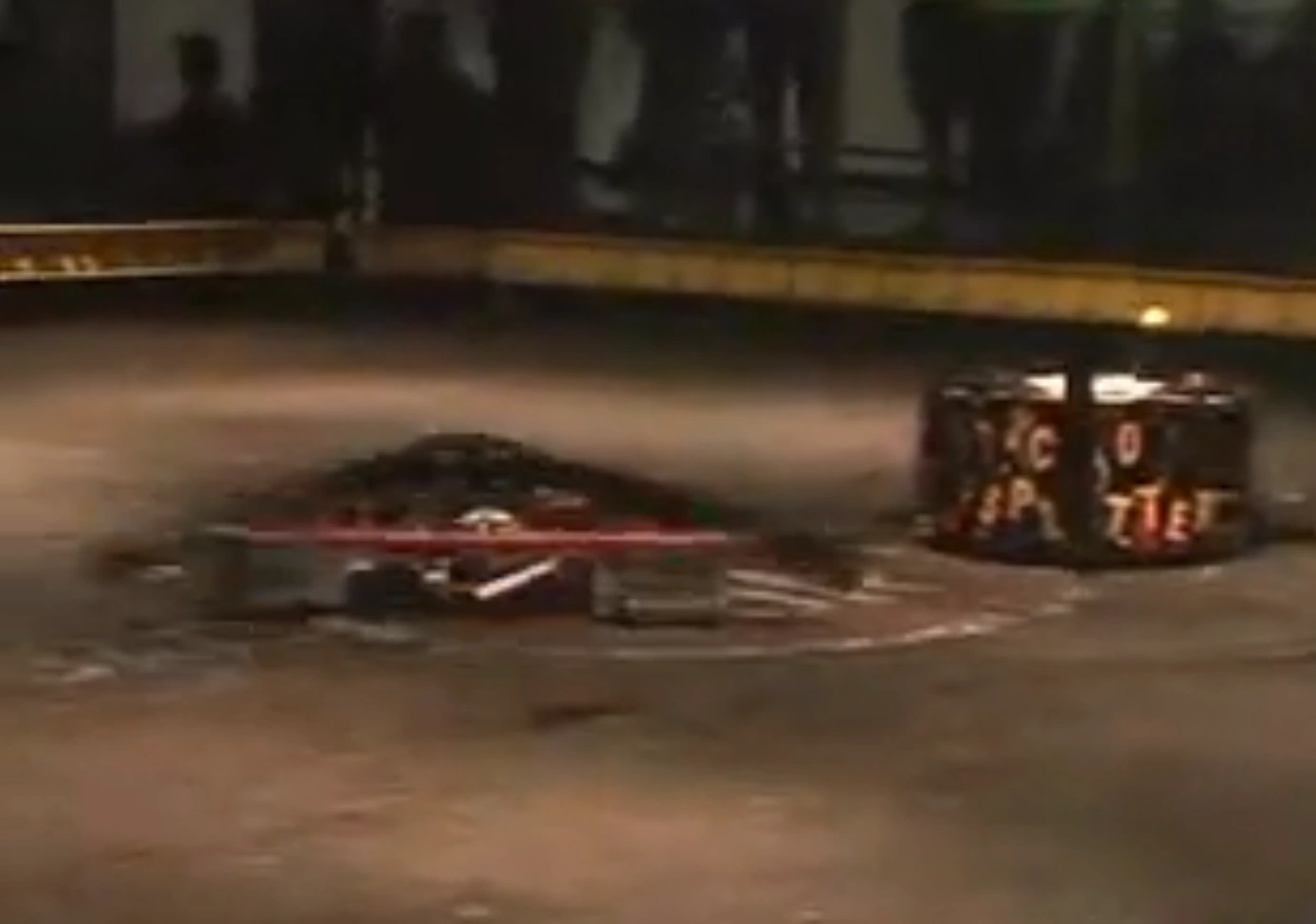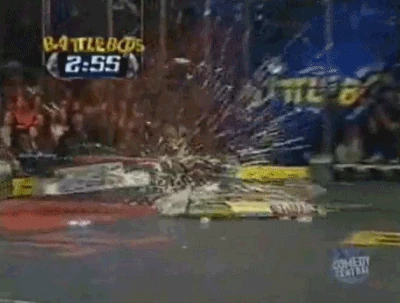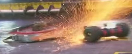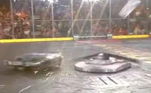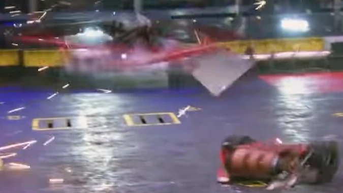Next for Son of Whyachi was Monsoon, which had come off a pretty decisive win over Petunia. When the match began, things were doing okay for both robots but Son of Whyachi delivered the first hits, the latter of which sending both robots into opposite corners. Both robots recovered before Son of Whyachi was sent straight up into the air but landed upright. Additionally, this hit had disabled Monsoon's weapon, allowing Son of Whyachi to move in for another attack, which tore off a front armor panel from its opponent. The final hit knocked out Monsoon by rupturing the battery and leading to the arena filling with smoke. Monsoon was counted out, giving Son of Whyachi the win by KO.