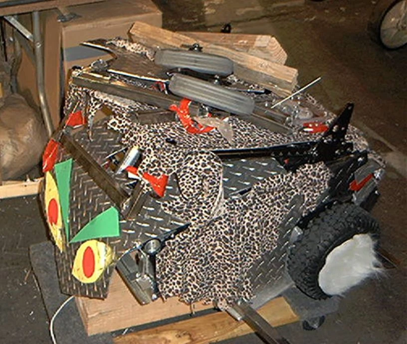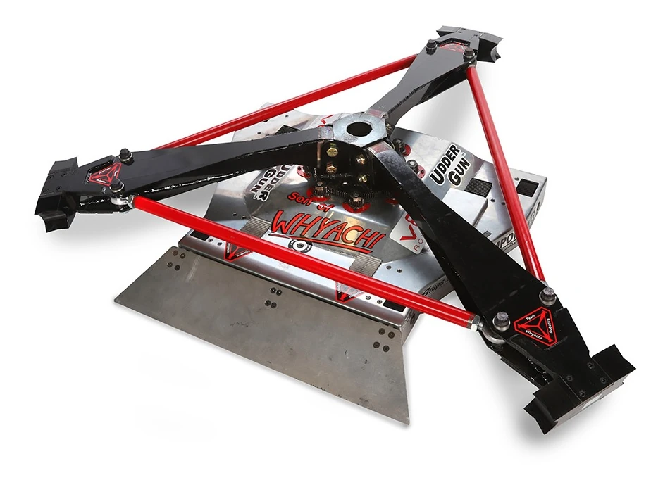 As its name suggests, Son of Whyachi was built as a lighter version of their previous robot Whyachi, debuting in the superheavyweight division of Season 3.0. Originally, it utilized a 'three-phase walking beam' mechanism as its source of locomotion, making it a shufflebot like its counterpart. For weaponry, Son of Whyachi sported a large cage spinner, as coined by builder Terry Ewert, consisting of an interconnected tri-bar spinner with a 5ft diameter and hammers at each end. The hammers, mounted close to the arena floor, were made out of hardened S7 tool steel and weighed 10-12lbs each, contributing to a total weight of 120lbs for the weapon alone.
