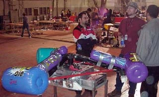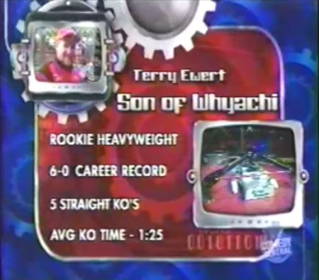 "Terry Ewert of Team Whyachi applied with the former champ Son of Whyachi; Ewert heard Mentorn needed good robots and wanted to exhibit his walking helicopter spinner one last time, before he replaced the walking mechanism with wheels. But the bot that had pulverized the champion Biohazard nine months before received a curt rejection over e-mail. Mentorn likely didn't want to use a robot that was so prominently associated with its rival BattleBots, but Ewert said, "I suspect they didn't want to repair the house robots"."