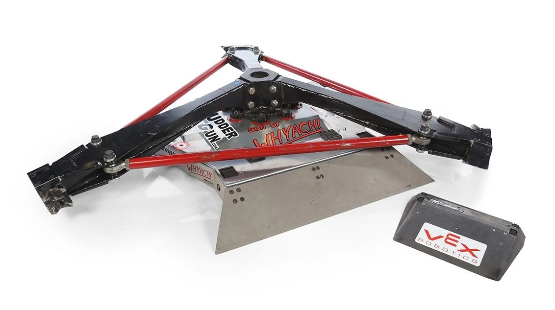 For Season 5.0, Team Whyachi built a brand-new version exchanging the robot's shuffling mechanism for a six-wheel drive system. This incarnation incorporated skid steer and a total of six of the team's customized Astro 40 gear motors, one for each wheel, in addition to two 12bhp Briggs & Stratton electric motors for the otherwise unchanged triangular spinner.[7][8] Though winning its first fight of the season against Steel Reign - after being allowed to bypass the preliminary stages - Son of Whyachi's attempt at redemption was cut short after losing a close judges' decision to No Apologies.