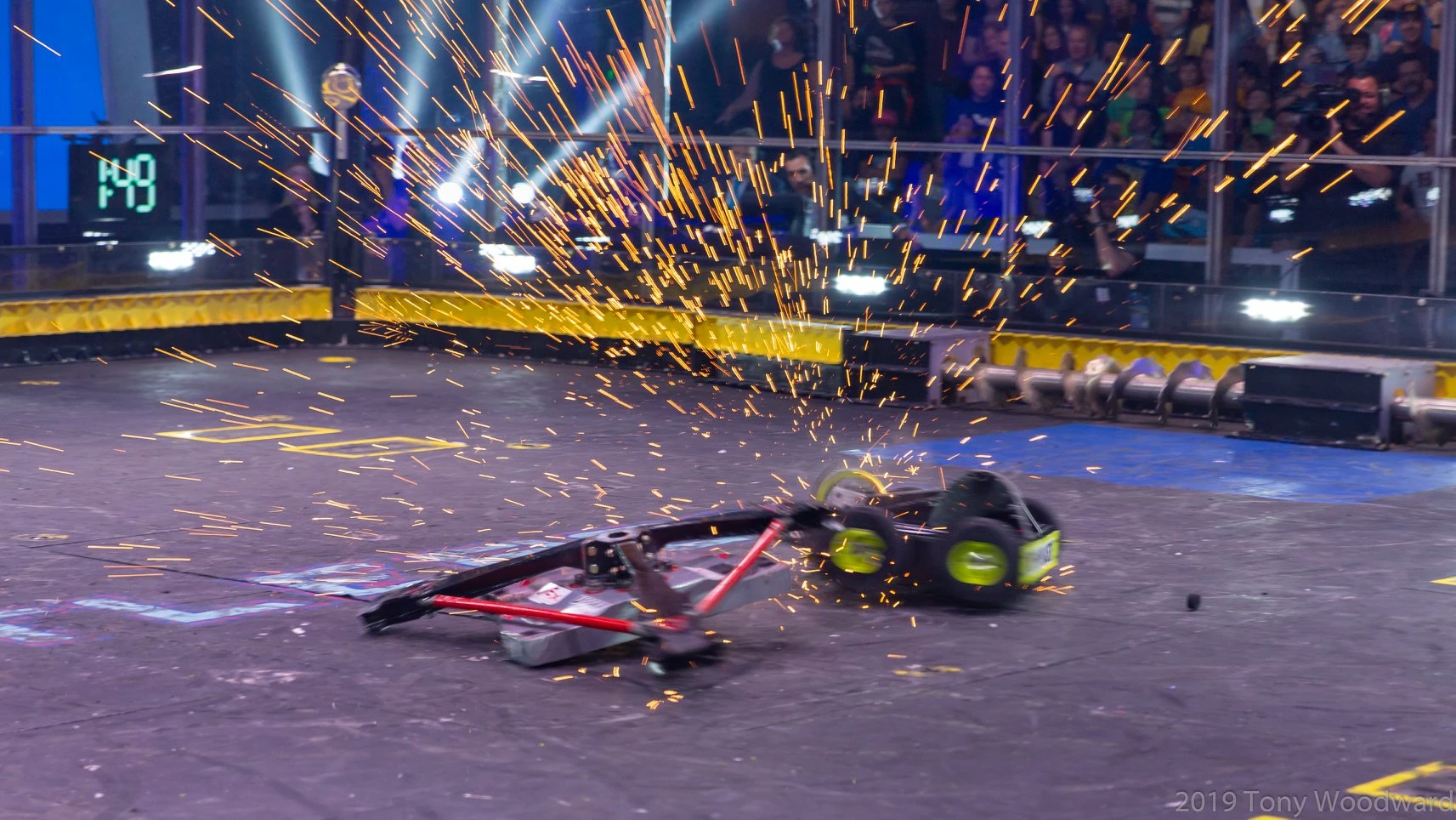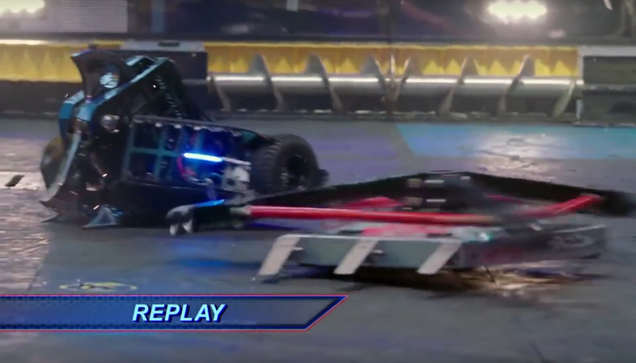 After the match, the team explained that they raised the hammers on the spinner, and had unbalanced the weight distribution in modifying the frame and in their rush had not cut down the last hammer before the fight.