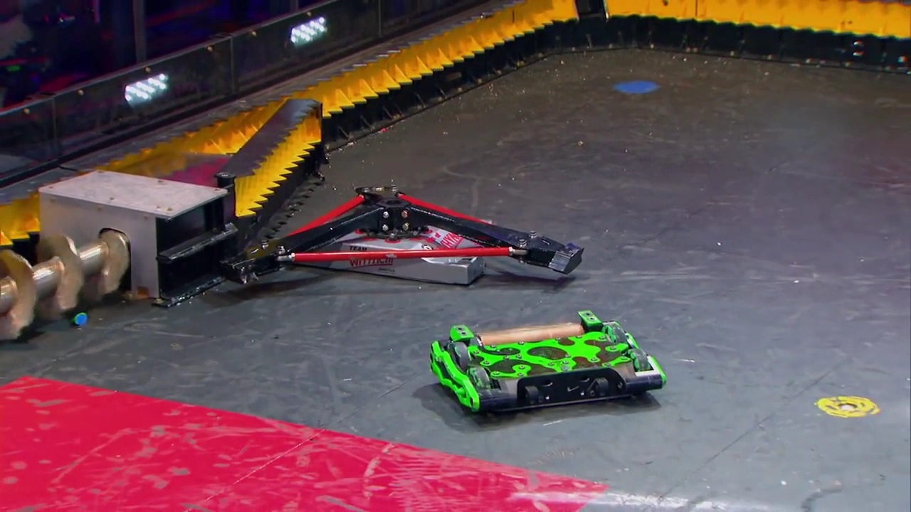Poison Arrow remained patient and the Ewert family's robot turned in place, reversing directly into its opponent's spinning drum. This caused Son of Whyachi to be launched violently across the BattleBox and into the screws behind the red square. This impact knocked Son of Whyachi out cold, damaging its main receiver.