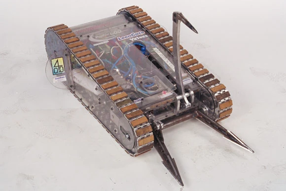 It was a large, tracked robot with low ground clearance. Its tracks were powered by 1400w motors and aided it being able to drive while inverted albeit without being able to use its weapons. Suicidal Tendencies was armored in 12mm layered Macrolon material.[1] It was armed with a pneumatic axe that could fire rapidly and lifting forks. Suicidal Tendencies weighed only 195lbs during its first season, 15lbs below the heavyweight limit at the time.