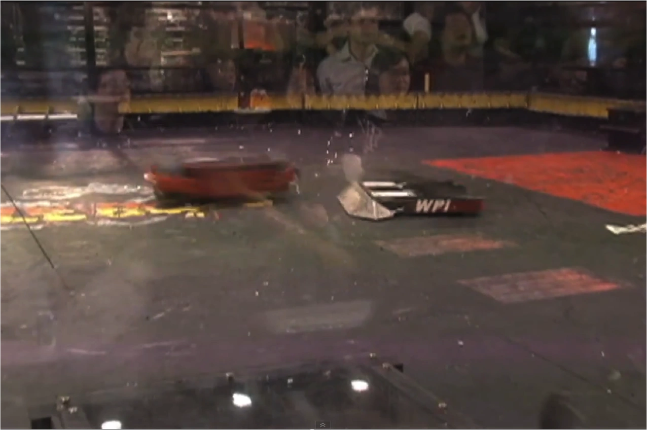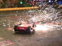 Surgeon General vs. HexaDecimator HexaDecimator flips Surgeon General on its rear end. Surgeon General hits HexaDecimator. Surgeon General advanced to the quarter-finals, where it was put up against HexaDecimator. The match started out with Surgeon General ripping off the weakened section of HexaDecimator's front armor. HexaDecimator got underneath Surgeon General and flipped it onto its rear end. Surgeon General was being counted out and Surgeon General tried starting and stopping its spinning disk weapon. Surgeon General was also going forward and reverse in hopes of rocking itself back on its feet. About 25 seconds into the countdown, Surgeon General managed to get itself back on its feet. As the fight continued, HexaDecimator quickly lost maneuverability due to metal chips from its armor getting stuck in the motor controller electronics and shorting it out after the internal controller cover had been knocked off. Surgeon General ripped into the rear of HexaDecimator, cutting right through its titanium armor. Surgeon General then hit one of HexaDecimator's air tanks, breaking it off and causing it to explode. This blew the valve right out of HexaDecimator and Surgeon General got its disk into the speed controller. HexaDecimator stopped moving and was being counted out. Surgeon General won by knockout to advance to the final four. |