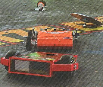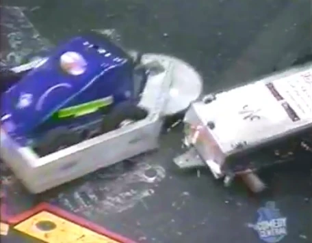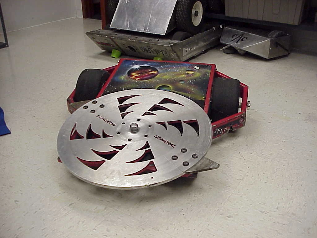 Surgeon General vs. KillerHurtz Surgeon General advanced to the Round of 16, facing UK veteran and Long Beach 1999 runner-up KillerHurtz. Surgeon General hits KillerHurtz from the side. Surgeon General rips off KillerHurtz's left side. Both robots went straight at each other and Surgeon General hits the right front of KillerHurtz. Surgeon General and its disk came to a halt as its receiver, which hadn't been securely seated, came loose. About 5 seconds later, Surgeon General and its disk started moving again and ripped into the right side of KillerHurtz, with CO2 venting out of KillerHurtz. Surgeon General took another hit on the left side of KillerHurtz, ripping off one of its drive wheels. KillerHurtz was no longer mobile and was being counted out by the ref. Surgeon General won by KO and continued on. |