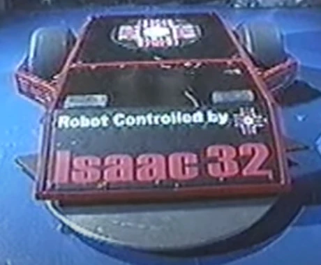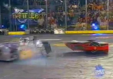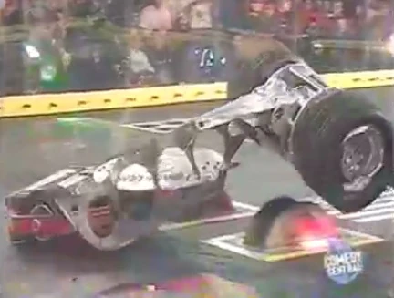Both robots approached each other tentatively from each side of the BattleBox, with Surgeon General starting from the red square. Surgeon General weaved and repeatedly dodged FrostBite as the latter tried to line up an attack with its own threshing drum. Its persistent evasion prompted some members of the audience to boo loudly, at which point Julio Roqueta's machine turned into FrostBite from the front-right corner. The aftermath between Surgeon General and FrostBite. A violent impact ripped Surgeon General's flywheel clean off, the weapon reaching a reported height of 4ftCitation?and spinning on its axle in various places across the BattleBox. While it was now completely weaponless, greater damage had been inflicted to FrostBite, which was now missing both of its right wheels. Surgeon General clambered over the top of FrostBite, then, after driving around from the side, got itself high-centered on the chassis of Michael Mauldin's machine. Neither robot could pull free for several seconds, with FrostBite's left drive chain slacking and jumping from its sprockets.
