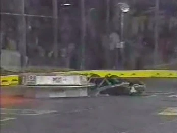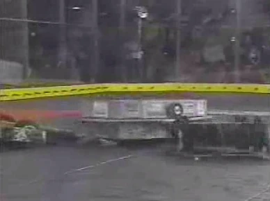 Swirlee vs. New Cruelty Swirlee, trapped in the corner. Now in the quarter-finals, Swirlee faced New Cruelty. In this bout, Swirlee tried to drive away from New Cruelty's box rush, but New Cruelty caught Swirlee and drove it into the corner of the BattleBox. New Cruelty maneuvered Swirlee toward the entrance ramp, but got caught under the spikestrip. However, Swirlee was not moving and eventually was counted out at 1:02. It turned out that the drive train on Swirlee had failed. |
