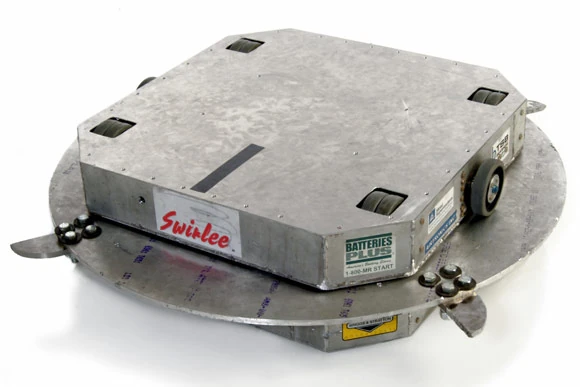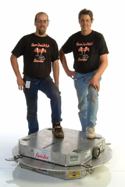 It was an invertible, sixteen-wheeled robot with a spinning disk named The Wheel of Selective Severance by the team, powered by the friction of two sets of wheels that were mounted on the top and bottom of the robot. According to the team, Swirlee was built in 12 weeks.
