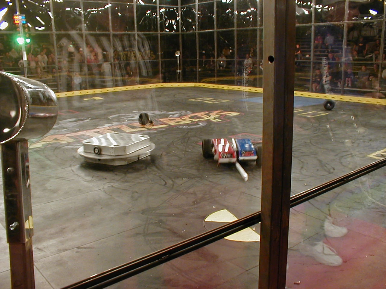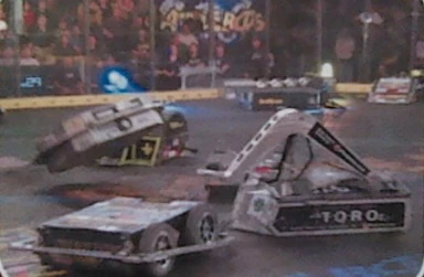 Swirlee vs. The Swarm Swirlee fighting The Swarm. Swirlee being pushed by Mosquito. This put Swirlee into the second preliminary round of the tournament where it fought The Swarm. In this fight, Swirlee was dominant at the beginning, using it's disk to knock Locust and Dragonfly away as they tried to stop its spinning disc. Eventually, Locust stopped moving, leaving two of the multibots to fight on. Dragonfly also lost half of its drive near the end of the match. Swirlee was pushed around by the low Mosquito, but still won the fight on a 25-20 judges' decision. |
