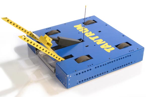 The first robot entered by future championship-winning builder Paul Ventimiglia, it was a blue and yellow, four-wheeled robot with a box-shaped chassis and pneumatic lifting forks as weaponry. Tantrum enjoyed limited success in its only season, losing its first match against Manic Aggressive.