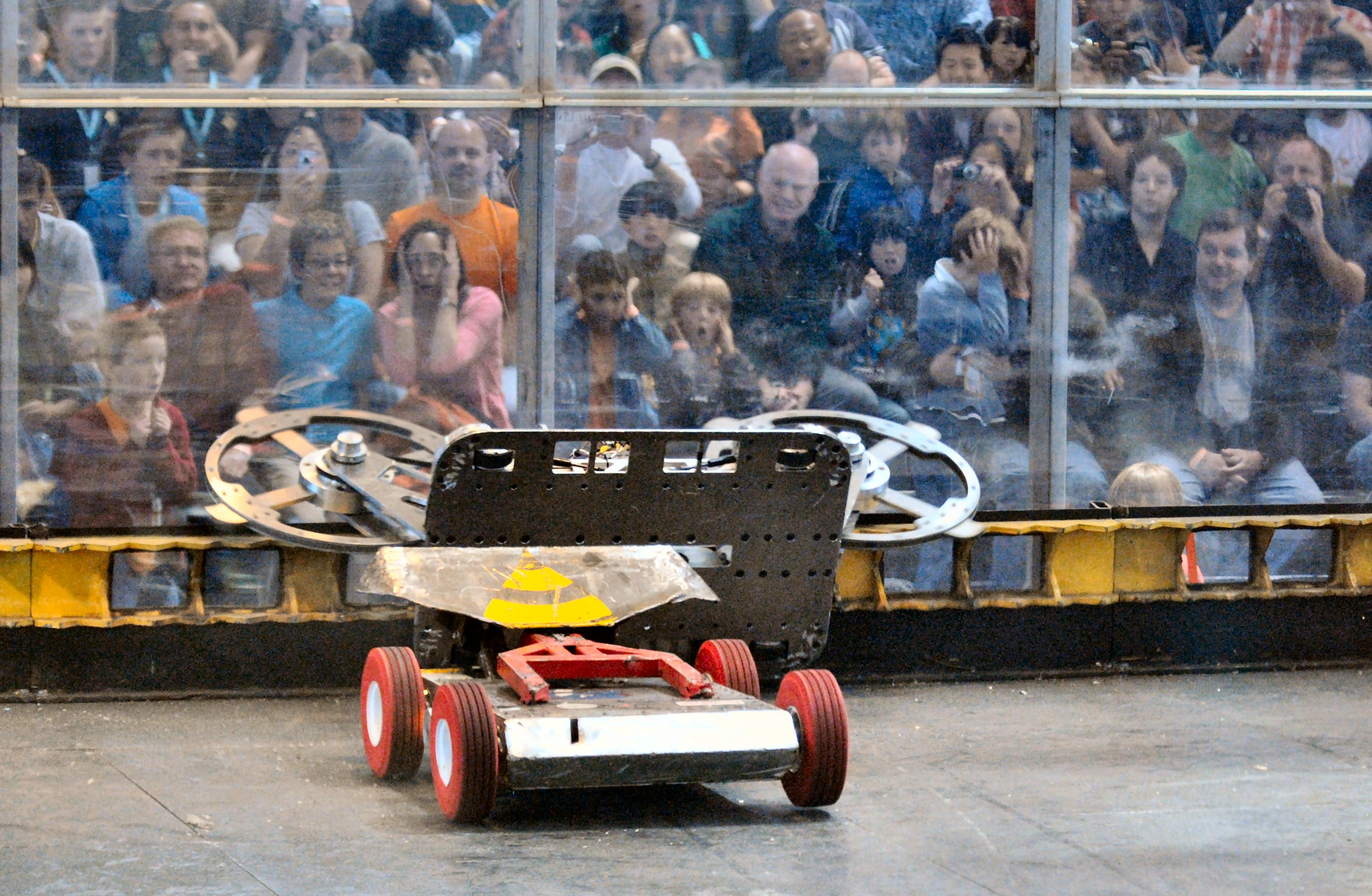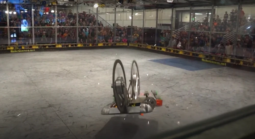 Returning for RoboGames 2015, Counter Revolution was scheduled to fight Gruff. However, Sam McAmis' team withdrew and Team Boilerbots moved on to face Whoops!. Having been pushed around for much of the match, Whoops! was able to overturn Counter Revolution and it was counted out. In the loser's bracket again, it defeated FunsDeads, Pump and Prometheus in succession before having its electronics scorched by The Great Pumpkin.