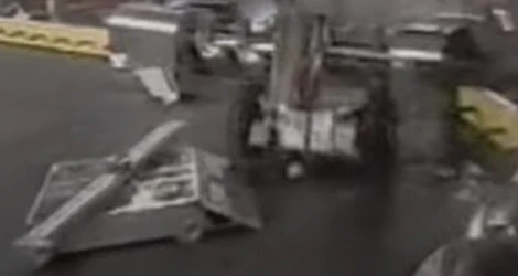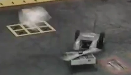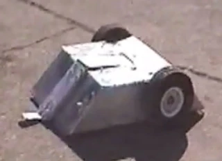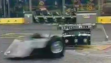 Timmy's front panel gets ripped off by Hazard... ...shortly followed by rear panel. Hazard delivers the final blow to Timmy. A completely destroyed Timmy gets pulverized. Timmy drove cautiously across the arena floor but Hazard scored a hit on Timmy's front panel, causing a hole. Hazard then maneuvered Timmy around for a while, before ramming Timmy into the spikestrip. Hazard then brought its blade back up to speed and ripped the entire front panel of Timmy clean off, sending it flying across the BattleBox. Timmy was struck once more, taking off one of the front panel supports. Timmy began driving in circles before Hazard charged in again and took the rear panel of Timmy off, incapacitating it. One last blow from Hazard spun Timmy into the pulverizer, where it was hit several times before being counted out. Hazard won by KO in 1:23 and Timmy was eliminated from the tournament again. Because Timmy was completely destroyed by Hazard, Timmy couldn't participate the middleweight consolation rumble at the end of the tournament. |
