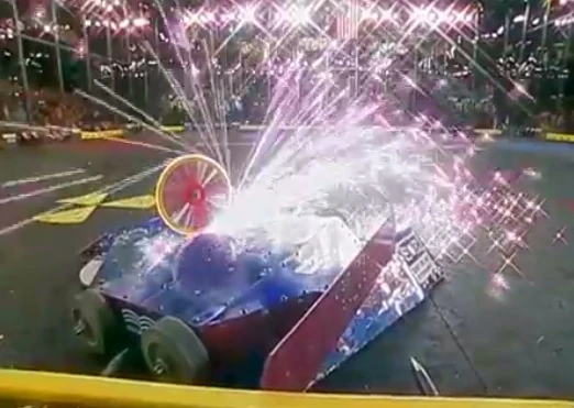 SABotage managed to flip Twin Paradox on its back, and eventually Twin Paradox suffered severe blows from the pulverizer where it broke 3 of its drive axles and lost much of its armor despite the fact that its disk was still functional. One of the blows actually hit the edge of one of Twin Paradox's wheels, causing pieces of the wheel rim to fly off. SABotage won by KO at 1:43 and Twin Paradox was eliminated from the tournament.