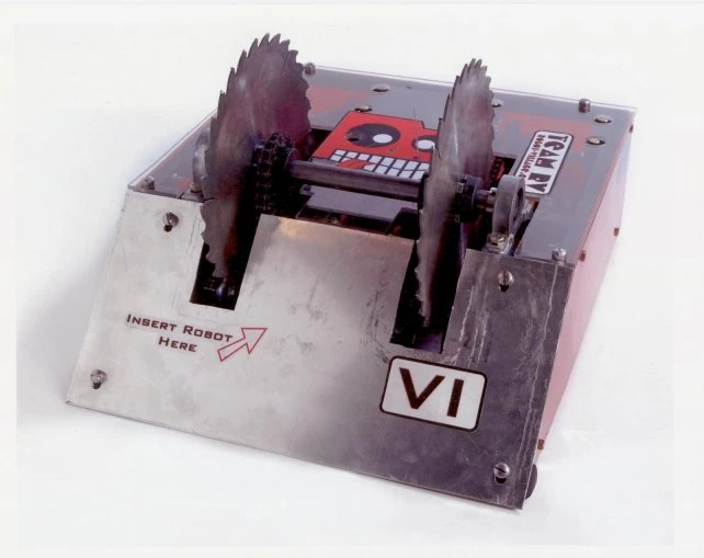 It was a two-wheel drive, box wedge-shaped robot armed with dual, 12" diameter saw blades powered by a 4" Magmotor running at 24V with 1:1 reduction. Its two drive motors were run at 24V, with a 5:1 drive reduction to 5" Colson wheels. Village Idiot performed well in competition, reaching the Round of 16 in Season 3.0 and the Round of 32 in Season 4.0.