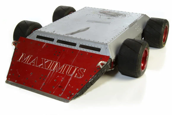 Another variation of the wedge design is a hinged wedge. Their main advantage is for gravity to keep the leading edge of the wedge flush to the arena floor, maximising opportunity for a robot to get underneath its opponent. Maximus was a successful example of this, who used its hinged front wedge to reach the semifinals of Season 5.0 and won the superheavyweight division at the Las Vegas RoboJoust event.