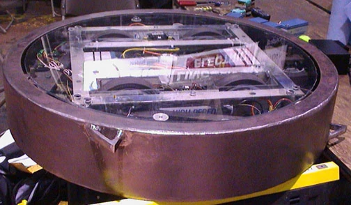 It was an invertible, four-wheel drive robot with a box-shaped chassis. It was armed with a spinning ring, which was powered by two motors connected to bearings via belts. These bearings spun and made contact with the outer shell, using friction to power it. The outer ring which featured numerous teeth welded to its outer perimeter in order to attack from different heights. The robot's name adorned its transparent top panel. XSYNGERY lost its only fight of the competition, though this proved notable as it was the first and only recognised battle between two ring spinner designs.